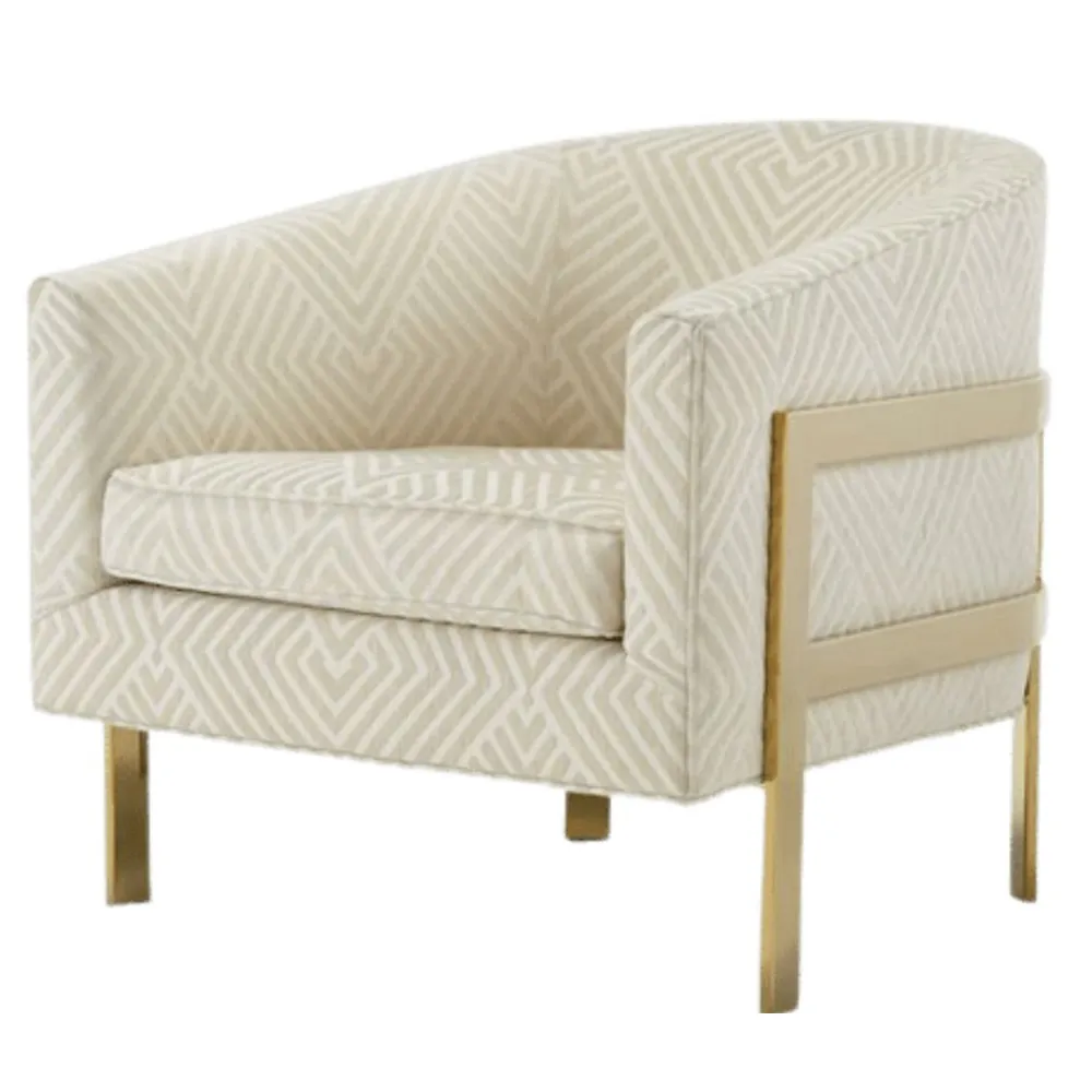 A very unique design of living room chair, a very beatiful design infused with metal and printed upholstery.